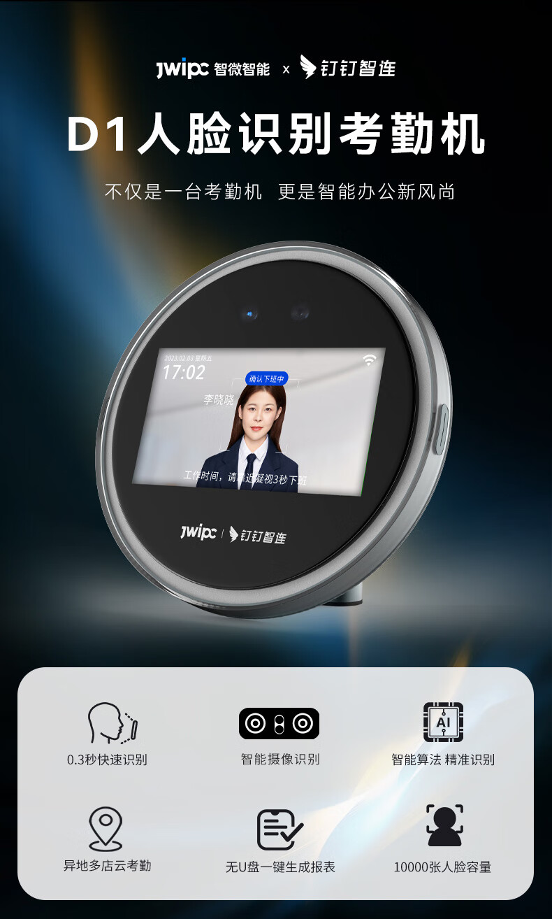 钉钉智联D1人脸识别考勤打卡机面部智能多地多店刷脸机上下班员工签到