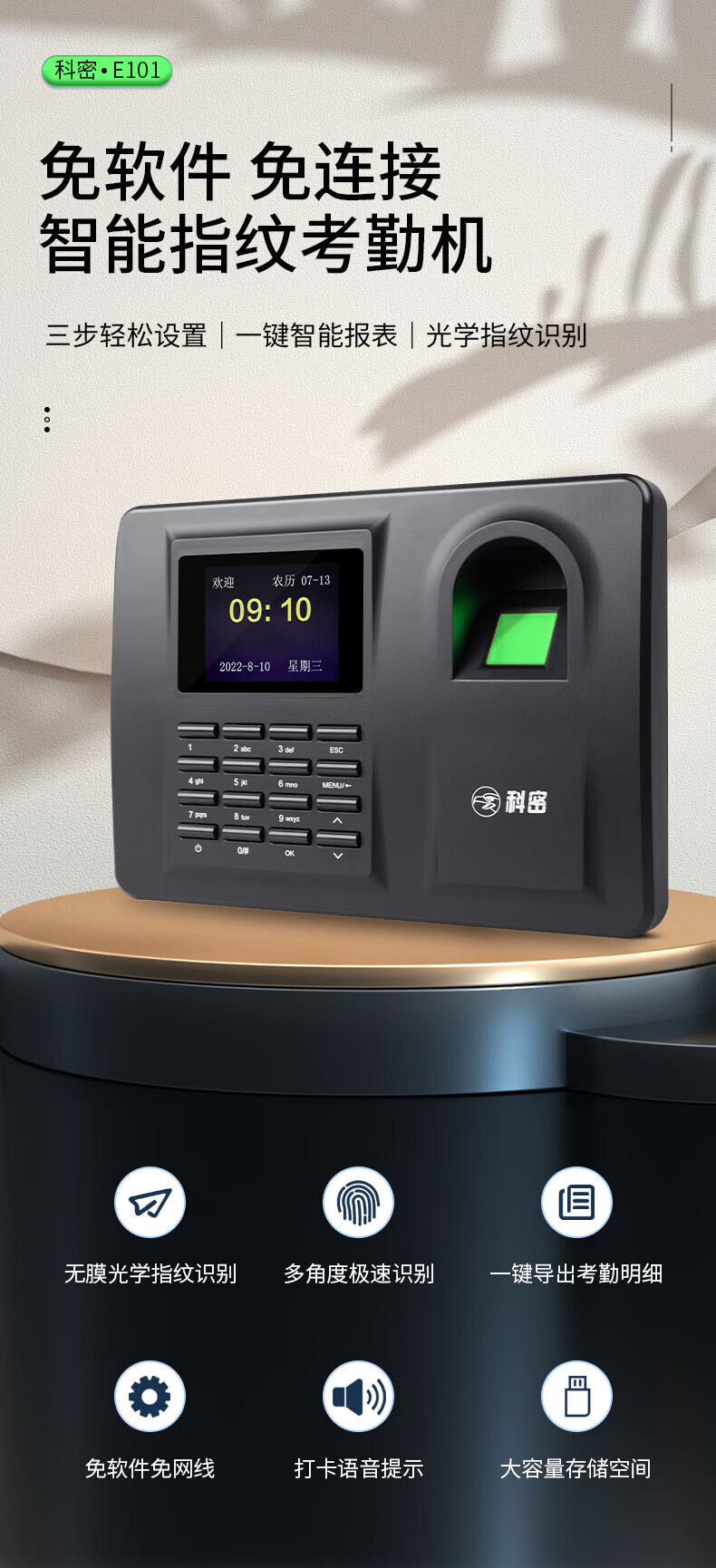 科密 E101指纹考勤机 免软件彩屏打卡器打卡机上下班签到自动生成报表