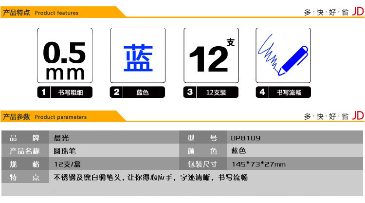 晨光(M&G)文具0.5mm蓝色按动圆珠笔 办公子弹头原子笔 商务考试中油笔 BP8109