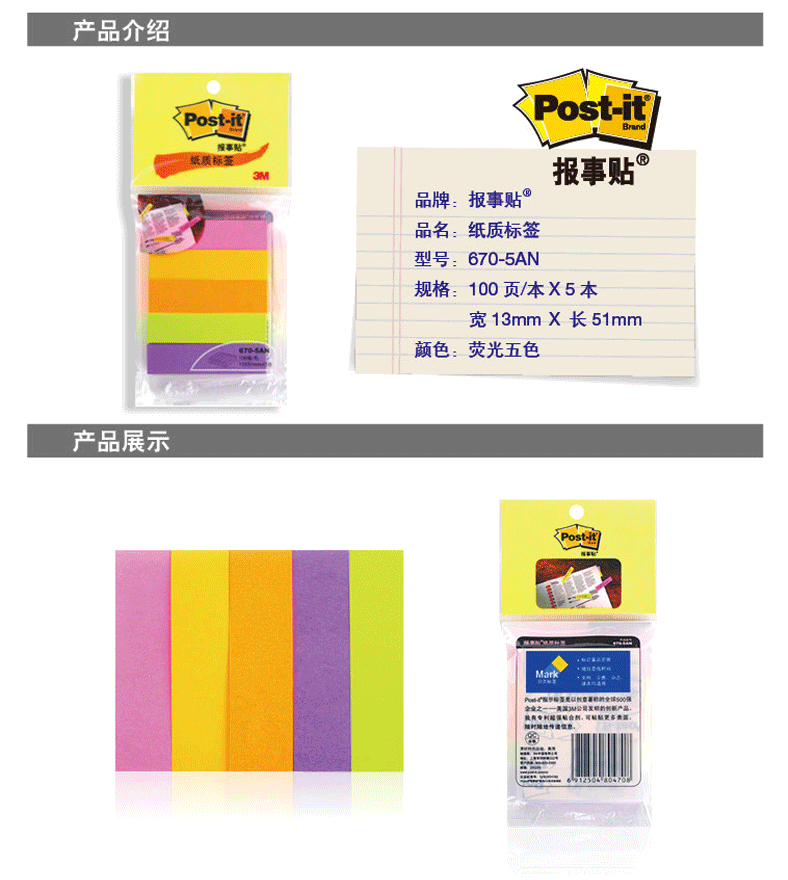 3M 便签 便条纸/便利贴/荧光指示标签 办公用品 670-5AN (5色装)
