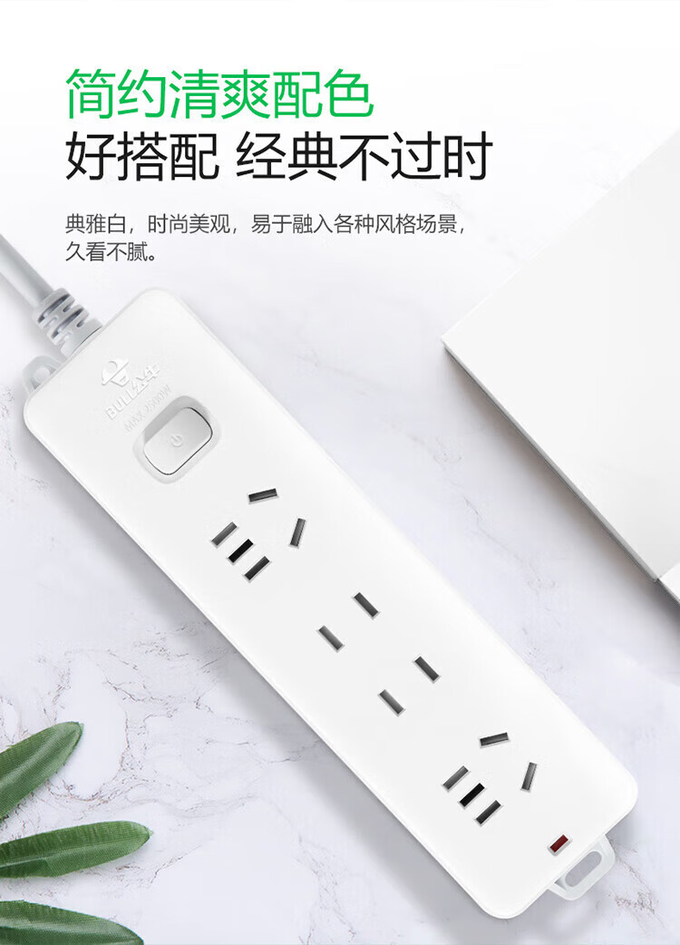 公牛 新国标插座/插线板/插排/接线板/拖线板 4位总控全长1.8米 GN211