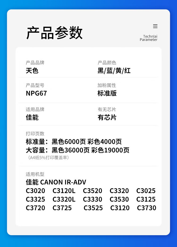 天色(6000页)NPG-67 黑色小容量粉盒适用佳能墨粉npg-67 c3020粉盒c3320l墨盒c3520打印机3025 【6000页】NPG-67粉盒/标准版/黑色