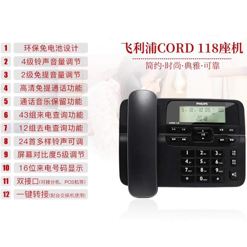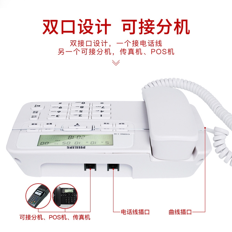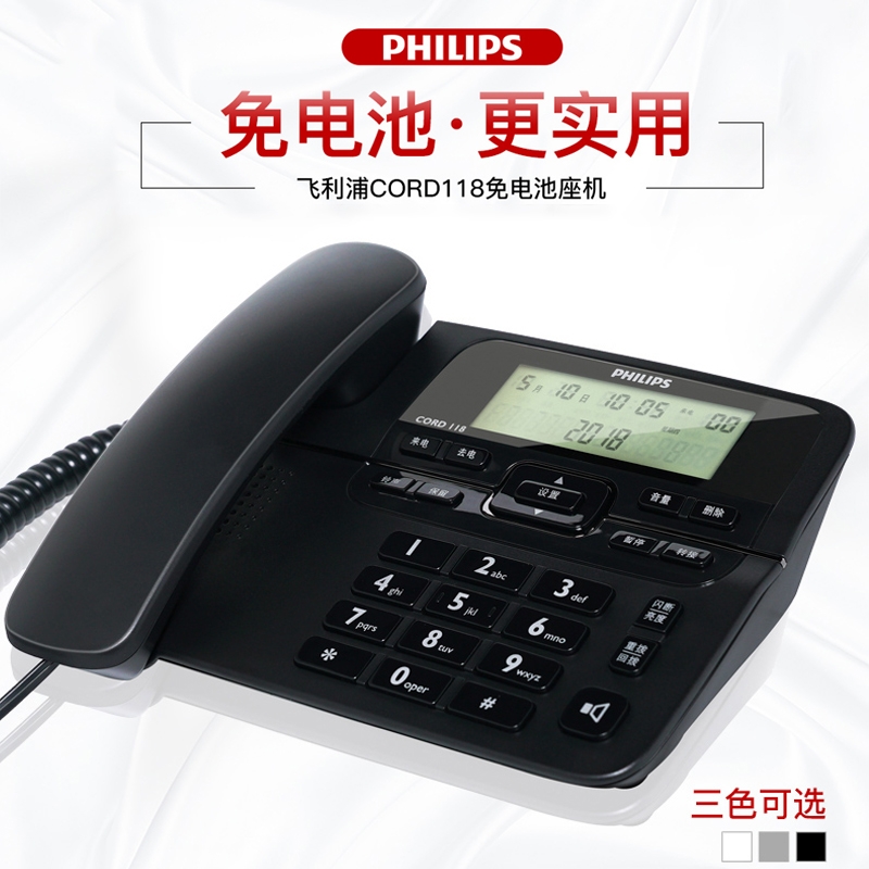 飞利浦(PHILIPS)电话机座机 固定电话 办公家用 来电显示 双接口 免电池 CORD118 颜色随机