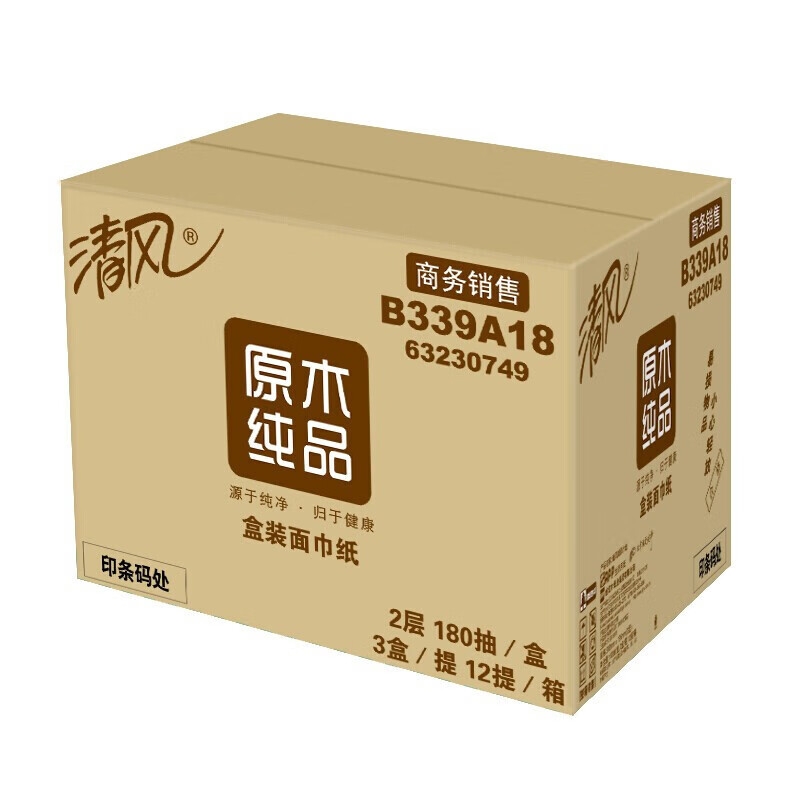 清风 B339A18原木纯品2层盒装面巾纸-180抽 210*198mm 3包/提